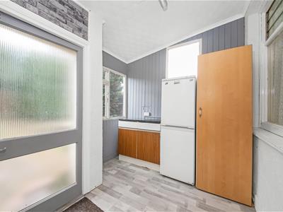 Painted panelled door, window to rear with opaque glazed door to garden, base unit, larder unit, part tongue and groove panelled walls/part textured walls, space for fridge freezer, fluoresecent strip light, textured ceiling, door to: