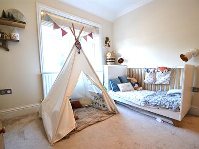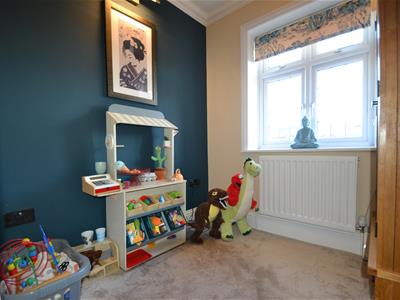 Neutral carpet, two tone emulsion painted walls, UPVC double glazed leaded window, ceiling light fitting, coving, radiator.