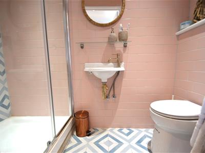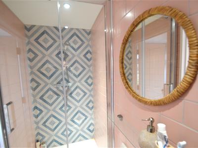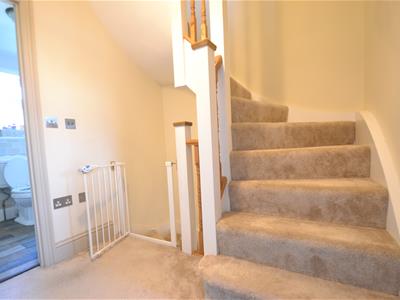 Tiled floor and fully tiled walls, large walk in shower enclosure with sliding entry door and wall integrated shower controls, wall hung wash basin, concealed cistern saniflow style WC, extractor fan, heated towel rail, spot lights. Eaves storage cupboard outside bedroom on 2nd floor landing.
