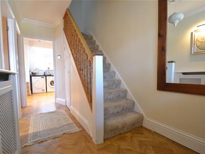 Enclosed UPVC double glazed porch, tiled floor, spot lights, panelled and painted front door with leaded and stained glass upper panel, UPVC double glazed leaded and stained glass side window, parquet effect Amtico style flooring, neutral emulsion painted walls, radiator, ceiling light fitting, under stairs cupboard.