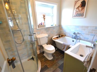 Wood effect tiled flooring, part tiles walls with remained painted in neutral emulsion paint, corner shower enclosure with curved glass sliding entry doors and wall integrated shower controls, free standing Victorian style bath with claw feet and a side mounted mixer tap with shower attachment, WC, vanity storage unit with top mounted wash basin, UPVC double glazed obscured glass window, ceiling light fitting, extractor fan.