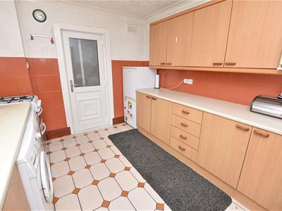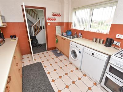 On the left hand side we have the kitchen which offers a range of wall and base units with contrasting work top, space for appliances, inset sink below with aspect over the front and door leading into the passageway.