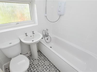 The bathroom offers a white suite which incorporates bath with shower over, wash basin and WC with part tiled walls.