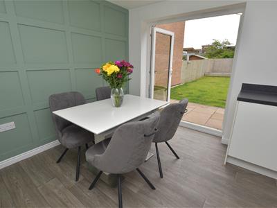 A great space, spanning the full width of the property enjoying the rear aspect over the garden with French doors off the dining area on the left whilst the kitchen is on the right offering a range of fitted wall and base units incorporating cupboards and drawers finished in white with inset appliances and space for fridge / freezer with contrasting worktops, inset sink below a window overlooking the garden and concealed gas central heating boiler.
