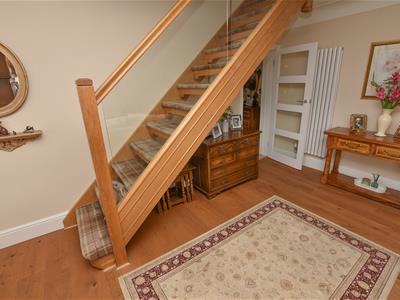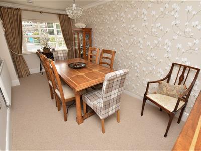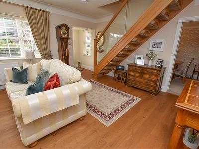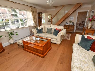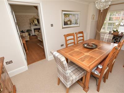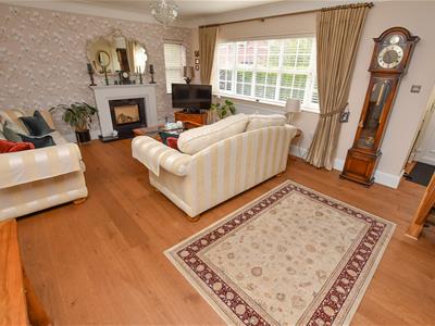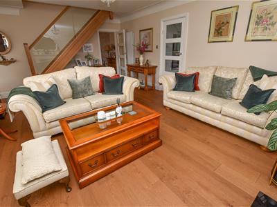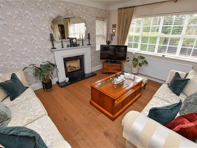 Bright and spacious with an abundance of natural light having a dual aspect, front and side and glazed internal doors. Ahead is a solid Oak staircase with glazed panels complimented by Oak flooring underfoot and a neutral decor including an inset gas fire and contemporary white Marble surround. Connecting doors into the dining room and breakfast kitchen.
