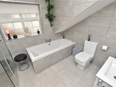 A contemporary 4 piece suite incorporating walk in shower with glazed screen, bath, WC and wash basin with vanity and chrome towel rail.