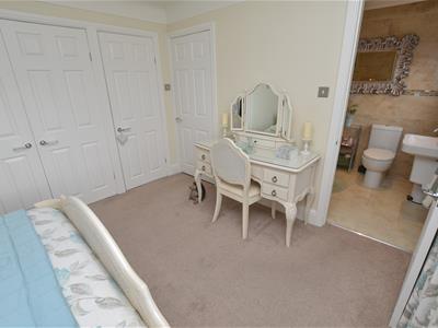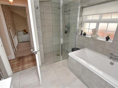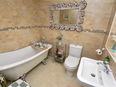 A well proportioned room with built in storage and a rear aspect with connecting door into White suite including a freestanding bath, WC and wash basin, chrome towel rail and stone effect tiled walls.