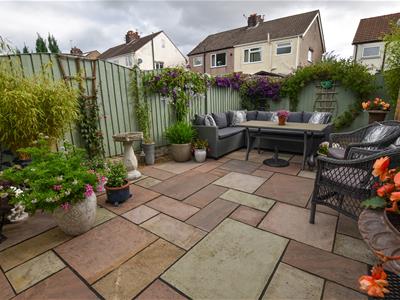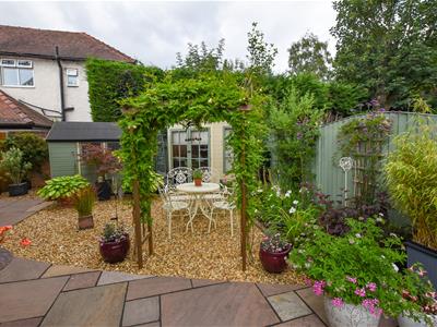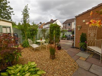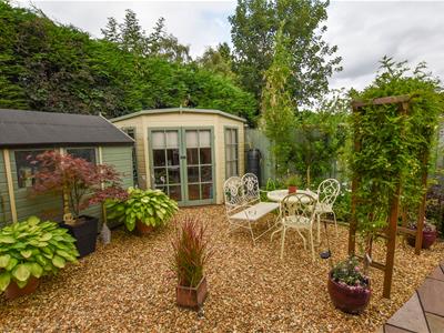 Multiple seating areas with a York stone patio laid to the immediate rear which continues to the side with a pebble stone finish and fenced boundaries.