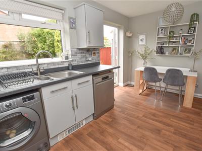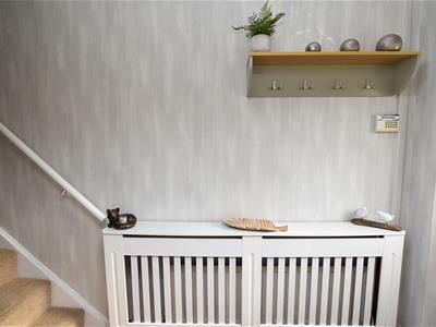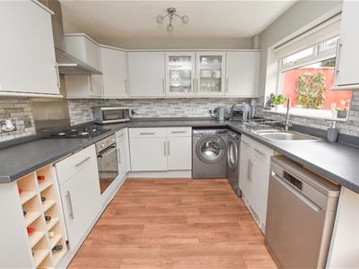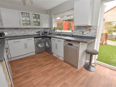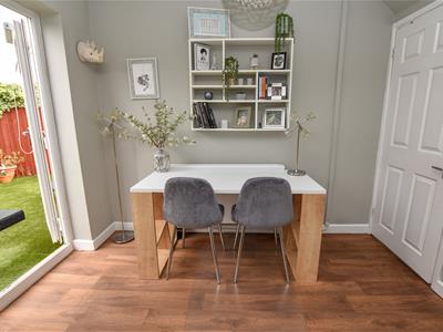 The dining area is positioned on the right with French doors opening onto the garden and understairs storage. Open to the kitchen which offers a wide range of wall and base units finished in Grey with complimentary worktops, integrated oven and space for appliances with aspect over the garden.