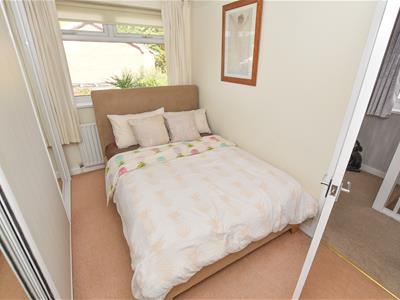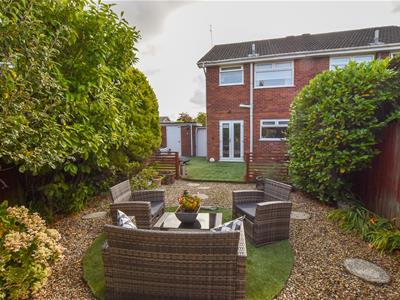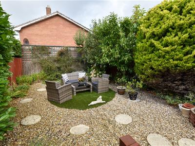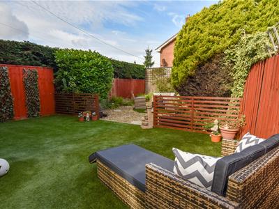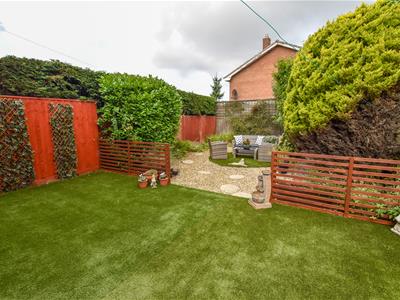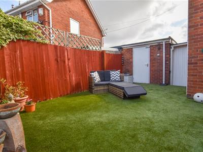 A larger garden which enjoys the sunny aspect with raised patio area covered in AstroTurf which continues to the side providing ample seating, timber divide with further seating having a stone finish and mature screen. Access to the covered store which opens to the front.