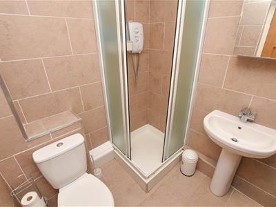 Finally the contemporary shower room offers a white suite which incorporates a low level flush toilet, wash basin and a corner shower with tiled walls.