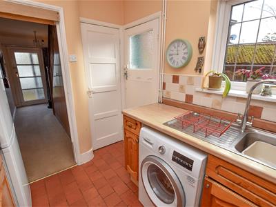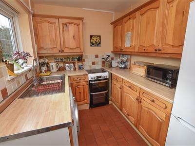 The kitchen offers a range of wall and base units with contrasting worktops, space for appliances and understairs cupboard. Door and aspect to the side.