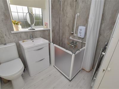 The shower has been updated and offers a contemporary white suite with WC, wash basin and shower enclosure. Built in cupboard which provides storage and hot water tank.
