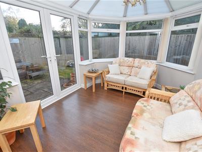 On the right hand side a well proportioned lounge with central fireplace and French doors opening into the Conservatory which provides extra reception space, overlooking the garden with French doors.