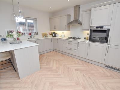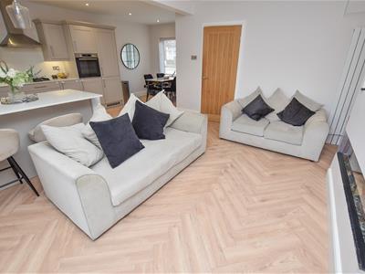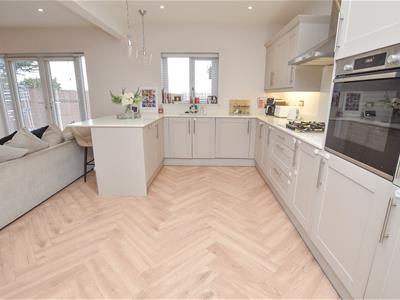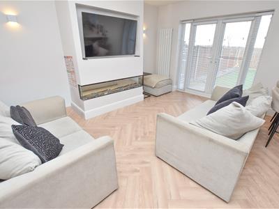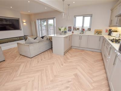 Wow... Natural light, open plan and contemporary decor! On the left you have a living area complete with media wall and inset fire, French doors leading out onto the rear garden and open to the fantastic kitchen which offers a wide range of units, integral appliances and breakfast bar whilst open to the dining area which overlooks the front.