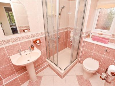 The shower room comes with a wash basin, WC and corner walk in shower with tiled walls.