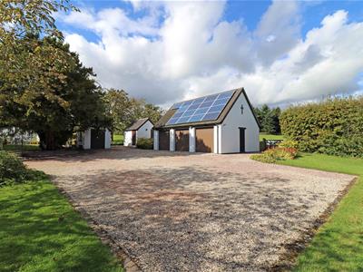 The property is set back from the road behind a tarmacadam area that leads to a diamond brace timber gate, which opens onto a gravelled driveway that provides ample parking and gives access to the triple garage. There is a lawned foregarden with a specimen yew tree, flowering cherry and prunus trees. A brick paved pathway leads to the rear porch as well as the oak front door, with canopy storm porch above, which opens into: