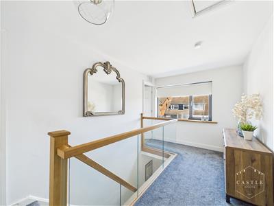 2.87m x 2.34m (9'4" x 7'8" )having contemporary white suite including freestanding bath, fully tiled shower cubicle with rain shower over, vanity unit with wash hand basin and wall mounted mirror, headed towel rail/radiator, fully tiled walls and flooring with under floor heating, inset LED lighting and upvc double glazed window with obscure glass.