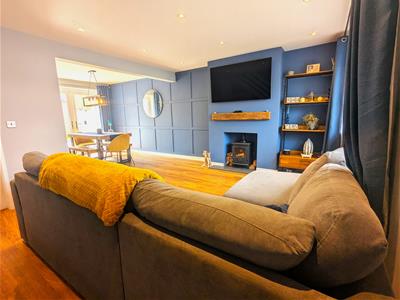 Step through the roomy front porch — perfect for storing coats, shoes, and bags — into a warm and inviting lounge diner, featuring a charming bay window and smartly panelled feature wall. Patio doors open directly onto the private rear garden, flooding the space with natural light and creating a seamless indoor-outdoor flow.