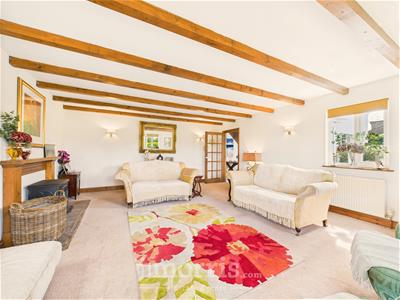 Continuation of tiled flooring, double glazed windows to side, radiators, beamed ceiling. Opening leads through to kitchen, folding glazed doors open to: