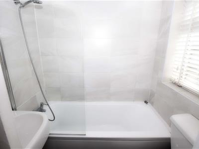 Window to side, White suite comprising low level WC, pedestal wash hand basin, bath with shower mixer tap, glass shower screen.