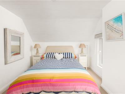 This well-designed space is currently utilised as a home office, featuring a trio of Velux windows that frame panoramic views across Praa Sands and the golf course. Offering an inspiring setting for work, the room also includes plantation shutters, allowing the natural light to be softened or fully blocked in the evenings.