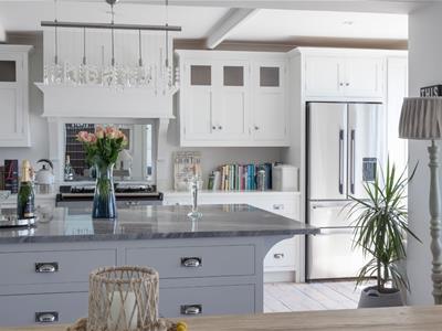 The well proportioned kitchen island is a perfect place for family breakfasts and cosy suppers.