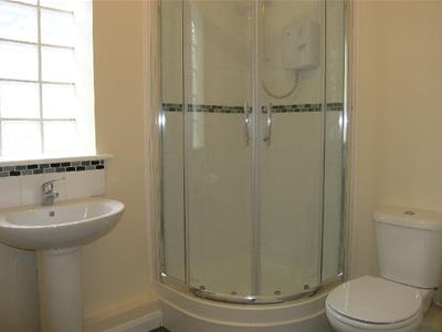 Having an obscured window, low level wc, pedestal wash basin, walk in shower cubicle, radiator.