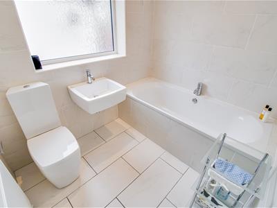 2.19m x 1.92m (7'2" x 6'3")Frosted wood framed double glazed window to the side, spotlights to the ceiling, central hating radiator, fully tiled. Low flush W.C., wall mounted wash basin with mixer tap, panelled bath with mixer tap.