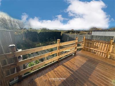 There are garden areas to the front and rear. The front garden features concrete pathways and a driveway providing off-road parking, along with pebble-dashed sections. The rear garden includes both pebble-dashed and paved areas, a raised decking area, and a useful storage shed.