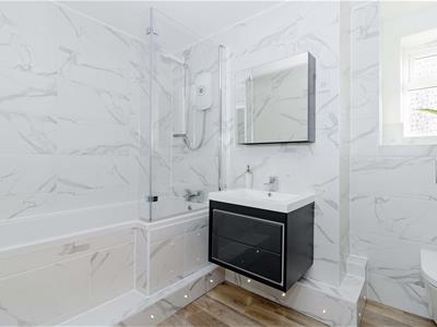 P shaped panel enclosed bath with chrome mixer tap, electric shower and glass screen. Wash hand basin set into vanity unit with matching chrome mixer taps. Low level flush WC. Heated chrome towel rail. Extractor fan. Part tiles walls.