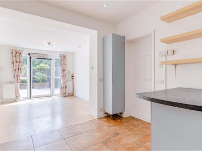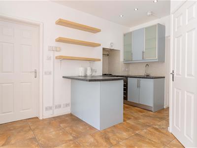 A range of base and wall units including drawers. Work surface incorporating basin and breakfast bar. Electric oven with four ring gas burner. Tiled splashback. Space and plumbing for washing machine and dishwasher. Radiator. Thermostat. Space for table and chairs. Spotlights.