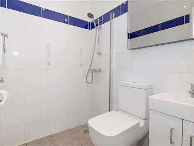 Wet room with shower. Tiled throughout. WC. Basin set in vanity unit. Wall mounted mirror. Spotlights.