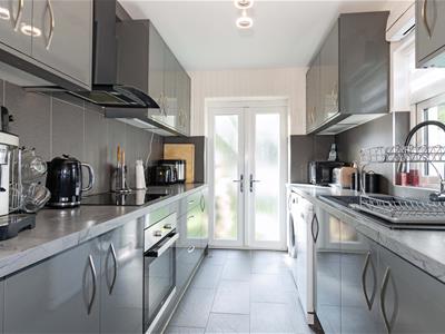 3.55 x 2.22 (11'7" x 7'3")A range of grey high gloss fronted base and wall units. Marble effect work top incorporating a contemporary black Franke sink with flexible mixer tap. Space and plumbing for slimline dishwasher and washing machine. Electric oven. Four ring electric hob with extractor fan over. Tiled splash back. Space for fridge/freezer. Tiled floor. Double glazed window. Frosted double glazed french doors to rear garden.