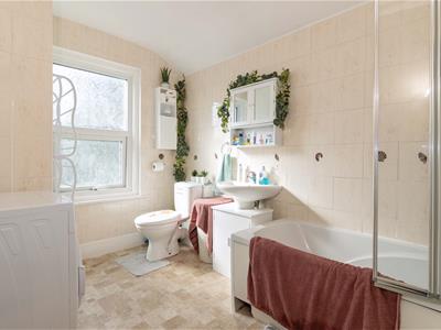 3.29 x 2.22 (10'9" x 7'3")Low flush WC. Panel enclosed bath with mixer tap and shower attachment. Basin. Tiled walls. Heated towel rail. Space for appliance. Airing cupboard. Frosted double glazed window.