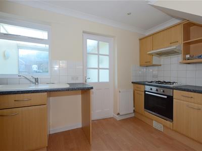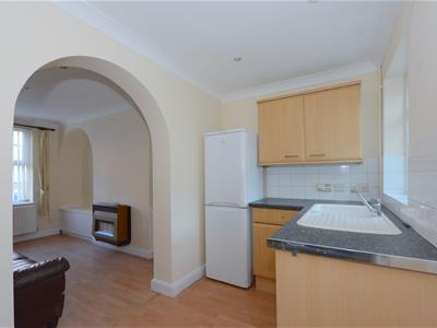 3.63m x 1.78m (11'11 x 5'10)Having eye level and base units with built-in cupboards and drawers, integrated oven four ring gas hob with cooker canopy over, tiled splash surrounds, wood effect flooring, fitted worktops with inset sink with mixer tap over, recessed spotlights and coving to ceiling, radiator.