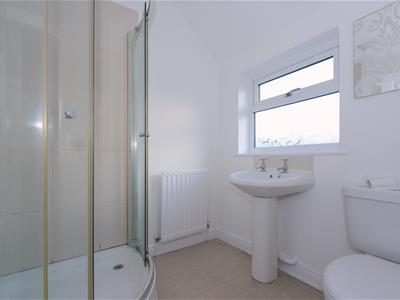 Having tiled shower cubicle, pedestal wash hand basin, low flush WC, radiator, coving and recessed spotlights to ceiling, upvc double glazed window to rear, vinyl floor covering.