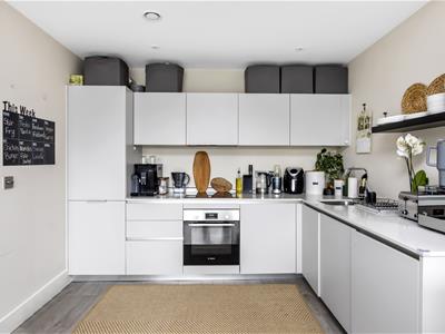 Silver stainless steel sink unit inset to a composite work surface with chrome mixer tap. Matching range of high gloss wall and base units with built in Bosch oven. Four ring Bosch hob with extractor hood over. Integrated Bosch dishwasher. Hot point washing machine and fridge/ freezer. Oak effect flooring. Opening into: