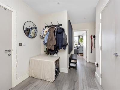 Oak effect flooring. Wall mounted video entry phone. Built in double storage cupboard with shelving and hanging space. Further storage area. Door into: