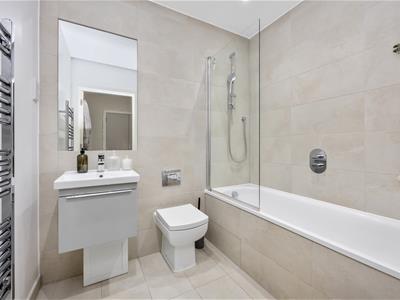 Panel enclosed bath with shower over and glass screen. Chrome central mixer tap. Concealed low level flush WC. Wash hand basin with matching chrome mixer tap inset into a vanity unit. Wall mounted chrome heated towel rail. Part tiled walls with mirrored inset and shaving point. Tiled floor. Skimmed ceiling with spotlights. Extractor fan.