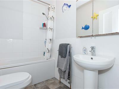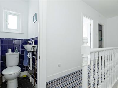 Double glazed frosted window. Wash hand basin. Radiator. Low level flush WC. Partially tiled.