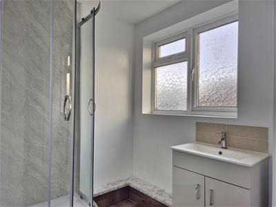 Cubicle with 'Triton' shower unit. Low level WC. Vanity wash basin. Tiled splashback. Heated towel rail. Extractor.